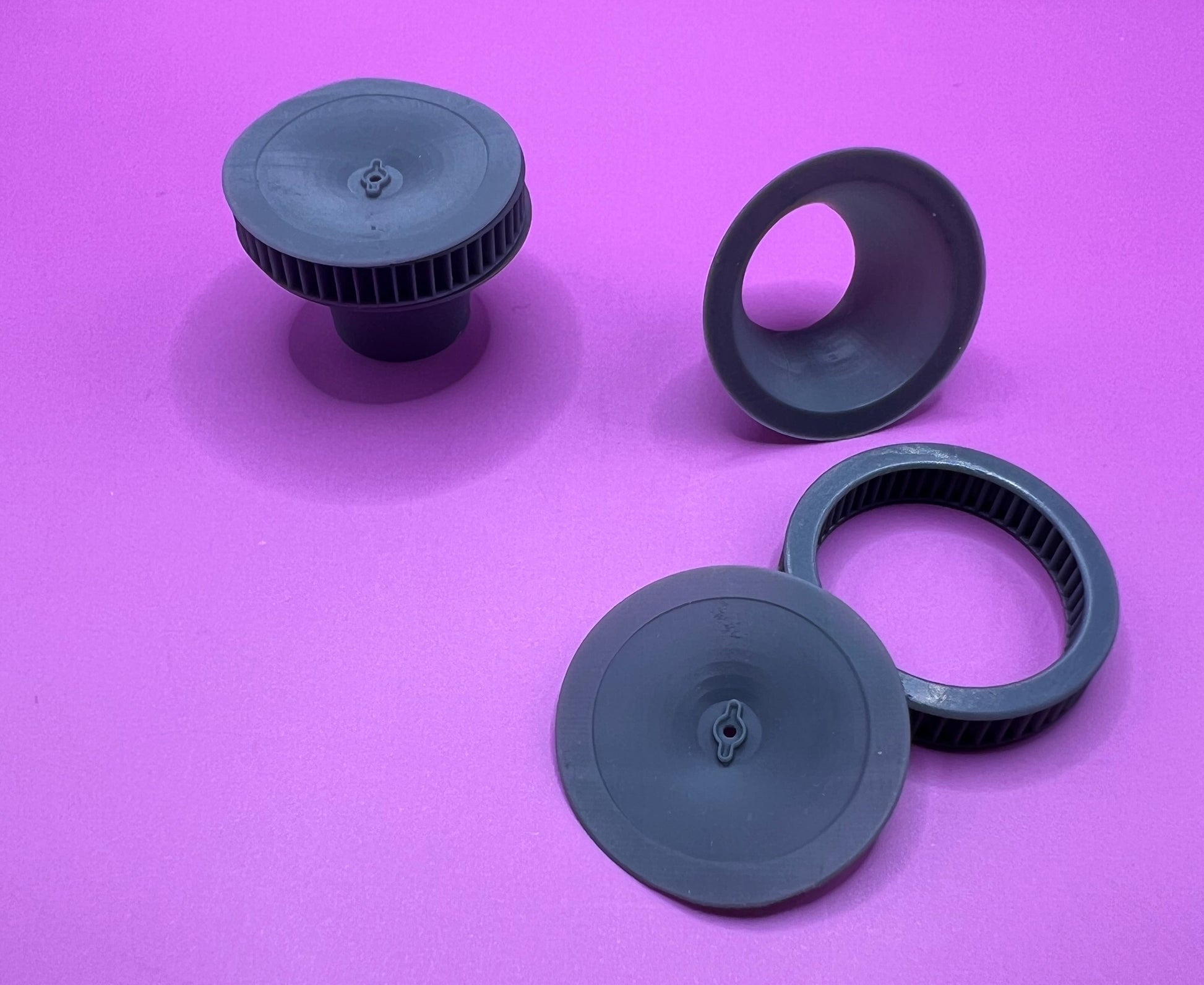 So you want your tunnel rammed or supercharged street machine to make a statement, these will do it! These velocity stack filters will fit any of our 4150 based Holley carburetors, just like the real version, and are available with 2" or 4" tall filters (this is the 2" version). To mount them on a dual quad setup the carburetors need to be oriented with the bowls facing each other (end to end). They have filter detail on both sides, lid, base, and filter are all printed separately, and all lids have a center hole for a mounting stud that you supply.