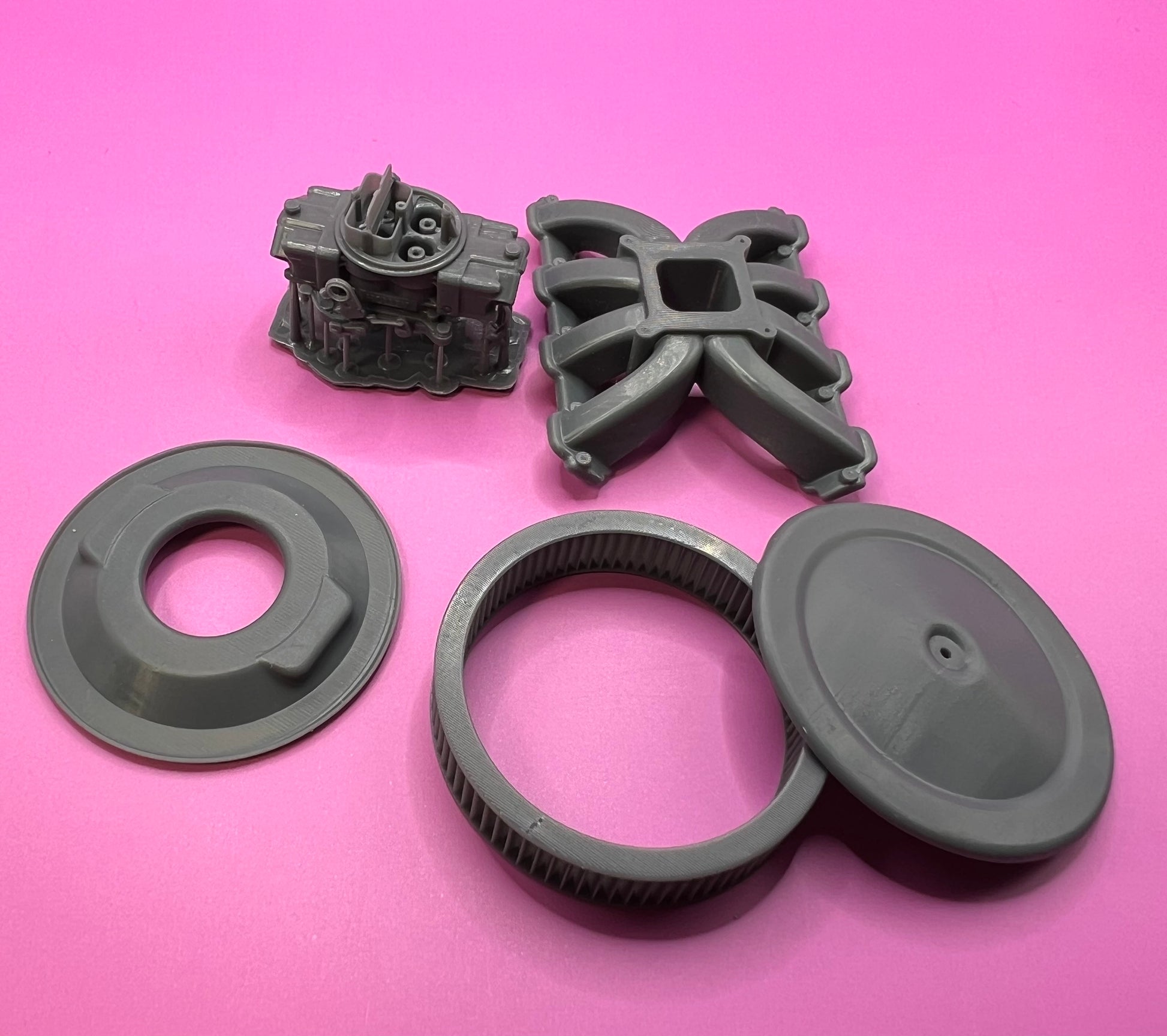 All of that detail is visible, no matter the scale, available in 1/25th, 1/18th (for the diecast crowd), 1/16th, 1/12th, 1/10th, and 1/8th. The standard configuration for the engine package has the engine assembled with heads, valley cover, Holley conversion oil pan, Holley offset conversion engine mounts, water pump, oil dipstick (handle is separate for 1/12 & 1/8 engines), bellhousing, and transmission together as they are all cast from the same aluminum. If you wish to have them printed separately, that option is available.