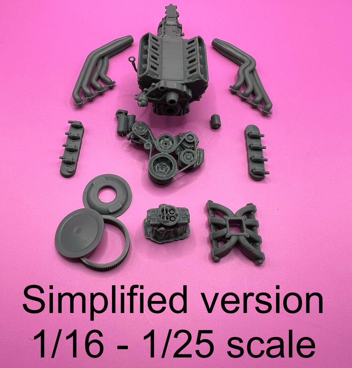 All LSX/T-56 packages include an accessory drive system featuring a Sanden AC pump, GM steering pump and reservoir, GM alternator, Model Behavior designed accessory bracket and 8-rib drive pulleys with molded in drive belt, and this accessory system is designed to minimize clearance issues with any installation. For engines in smaller scales, 1/25 to 1/16, the accessories and bracket are all printed together for ease of assembly.