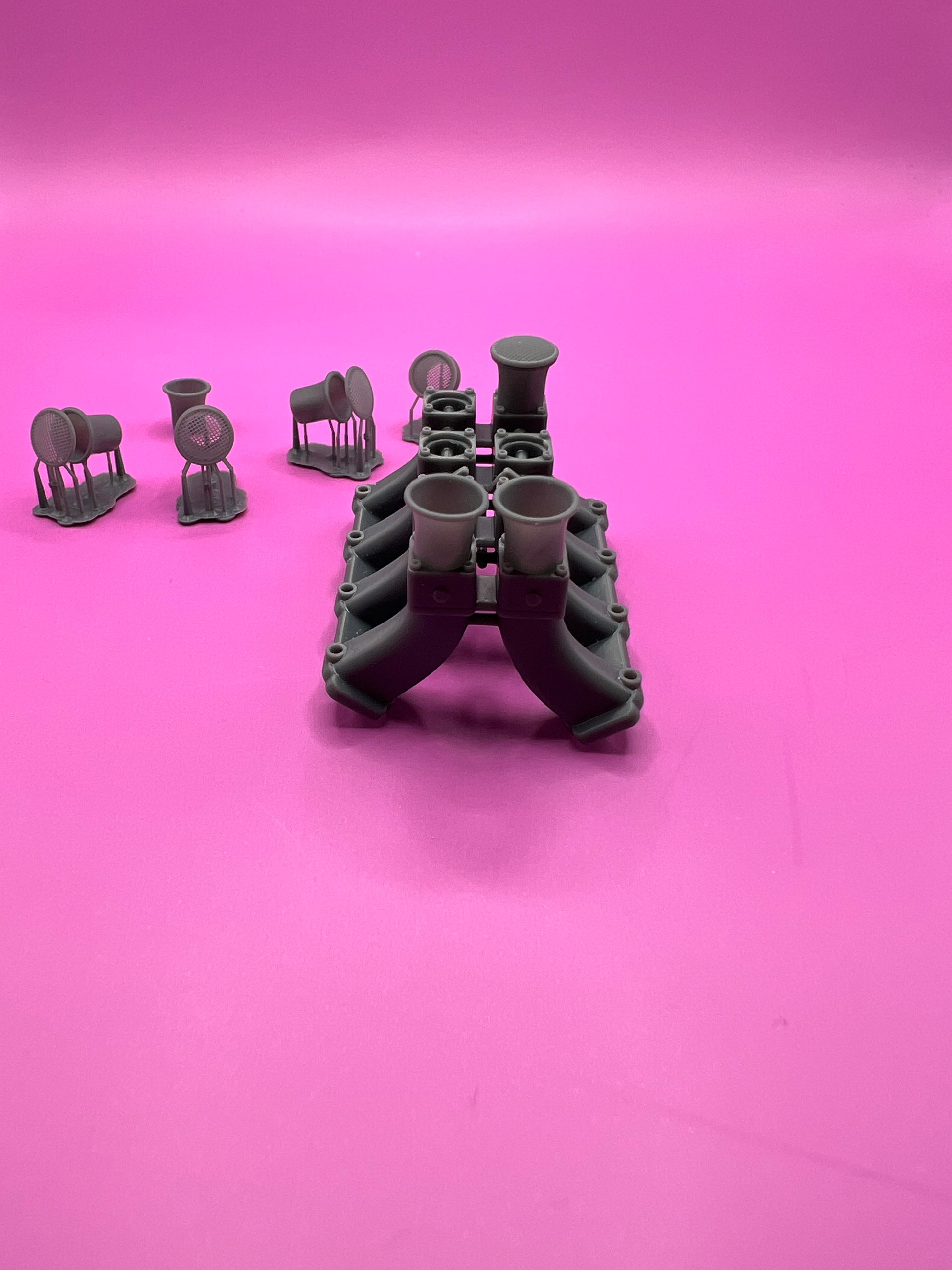 If you want to make your LS engine stand apart from the rest, we have a solution! This is the new Model Behavior ITB Manifold package and it comes with the base and throttle bodies molded in one piece with separate "trumpets", screens, and fuel rails with injectors and fittings attached. The manifold also has throttle arms in the center and you can connect them as you please, the air horns look spectacular painted with Revell chrome, and the optional screens can as well or, if you want them in black, Rit dye is the best way to keep the detail from getting lost with thick paint.