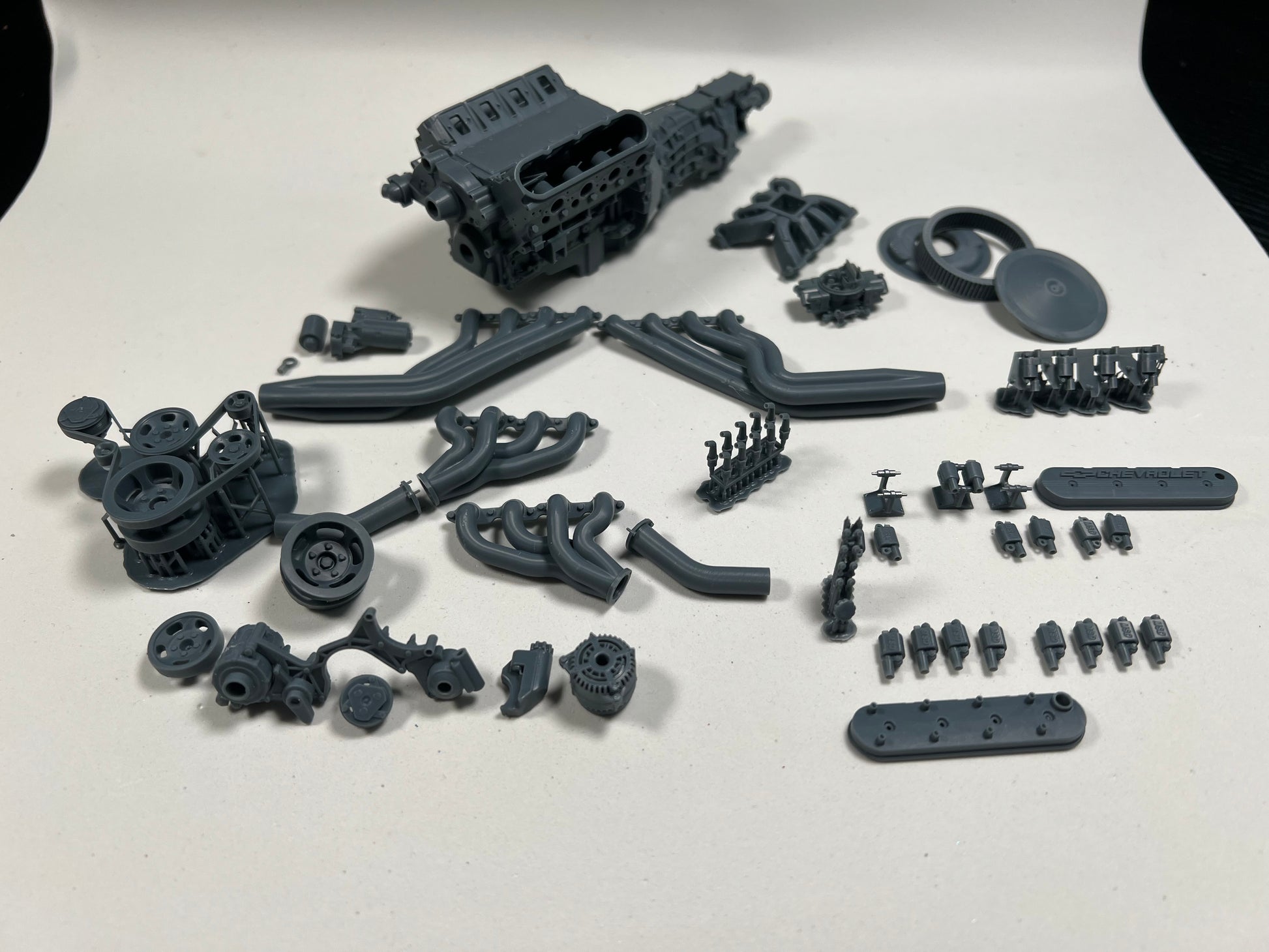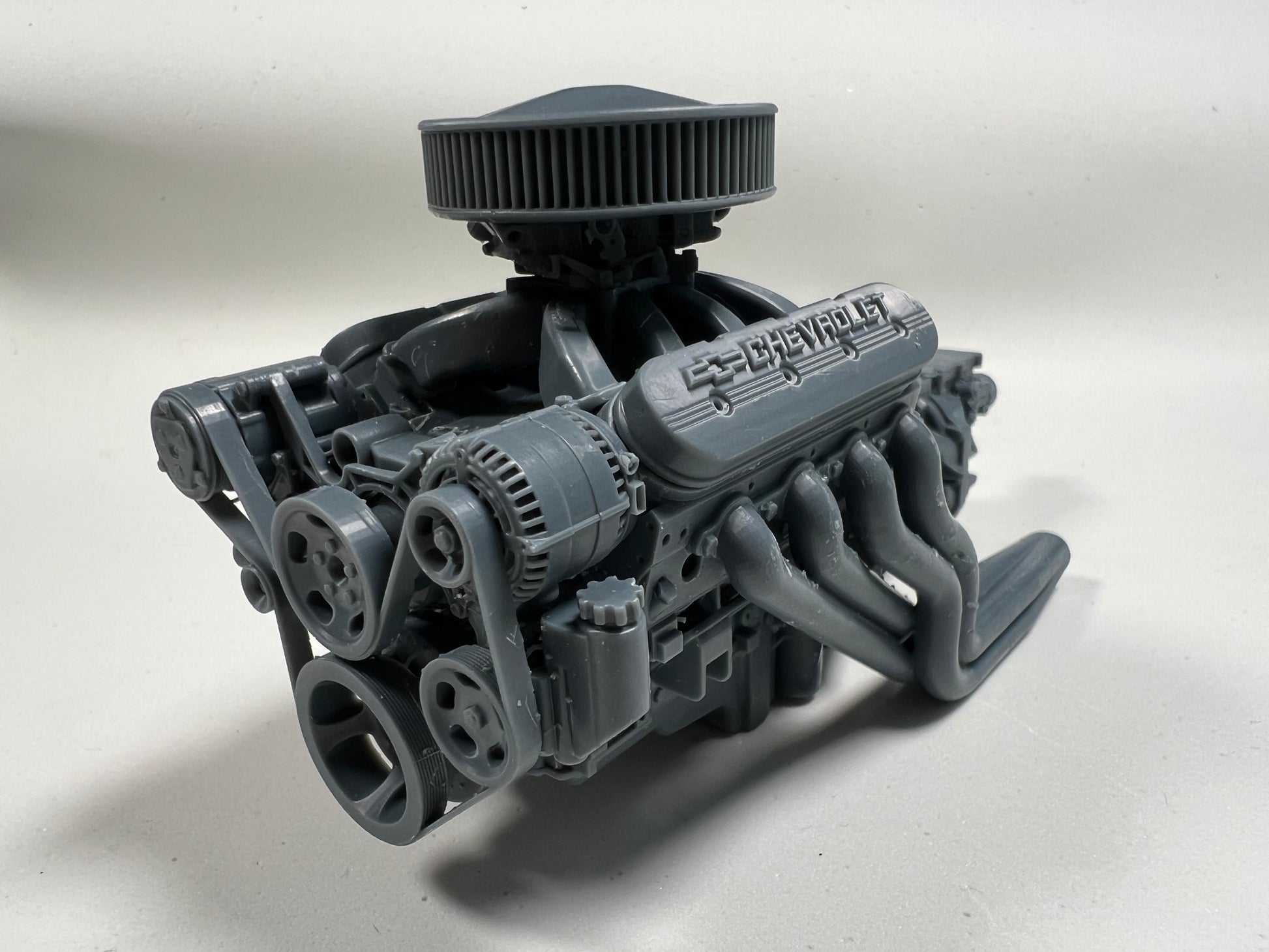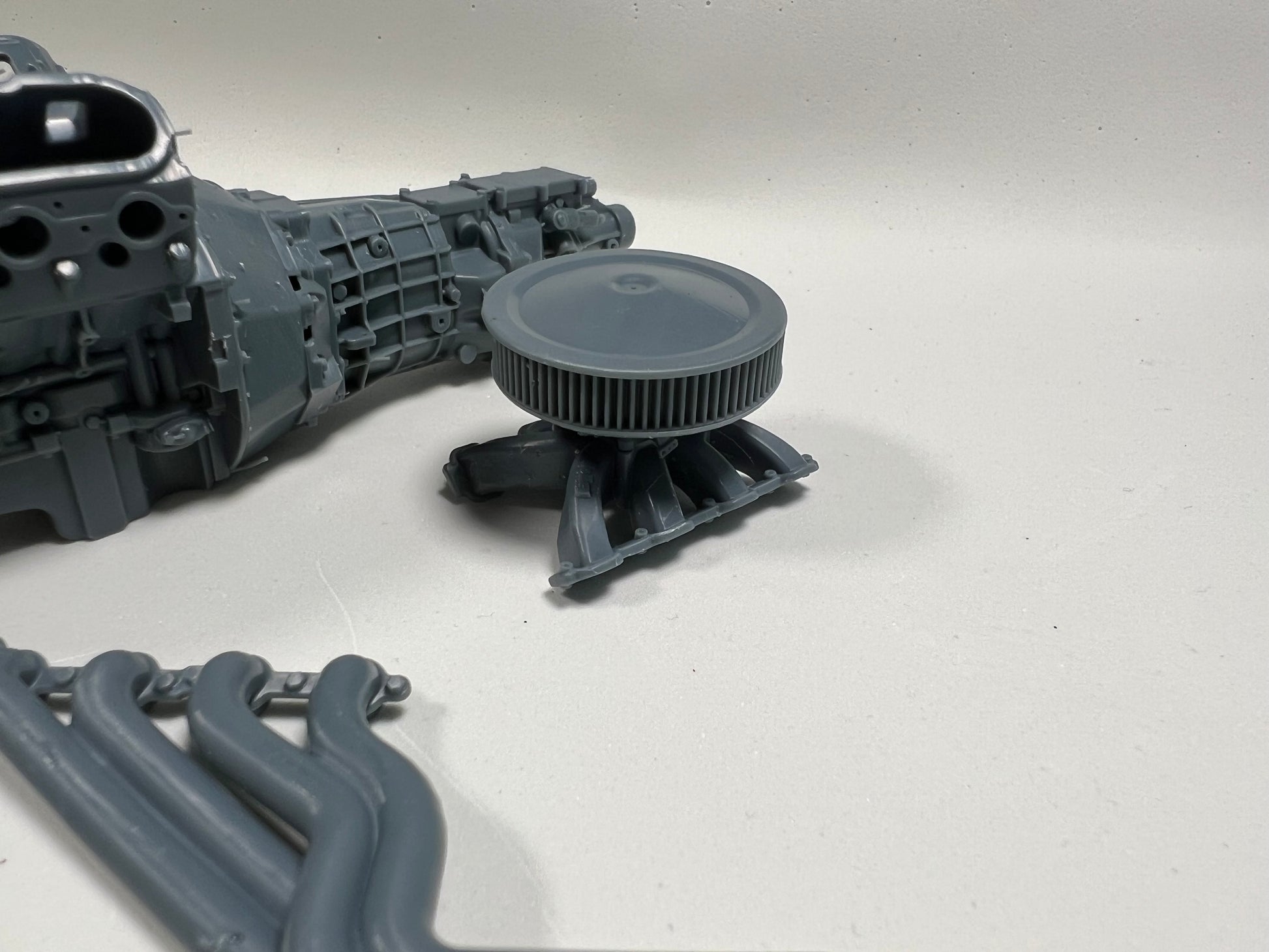 All of that detail is included, no matter the scale, available in 1/24th, 1/18th (for the diecast builders), 1/16th, 1/12th, 1/10th, and 1/8th. The standard configuration for the engine package has the engine assembled with heads, valley cover, Holley conversion oil pan, Holley offset conversion engine mounts, water pump, oil dipstick (handle is separate), bellhousing, and transmission together as they are all cast from the same aluminum. If you wish to have them printed separately, that option is available.