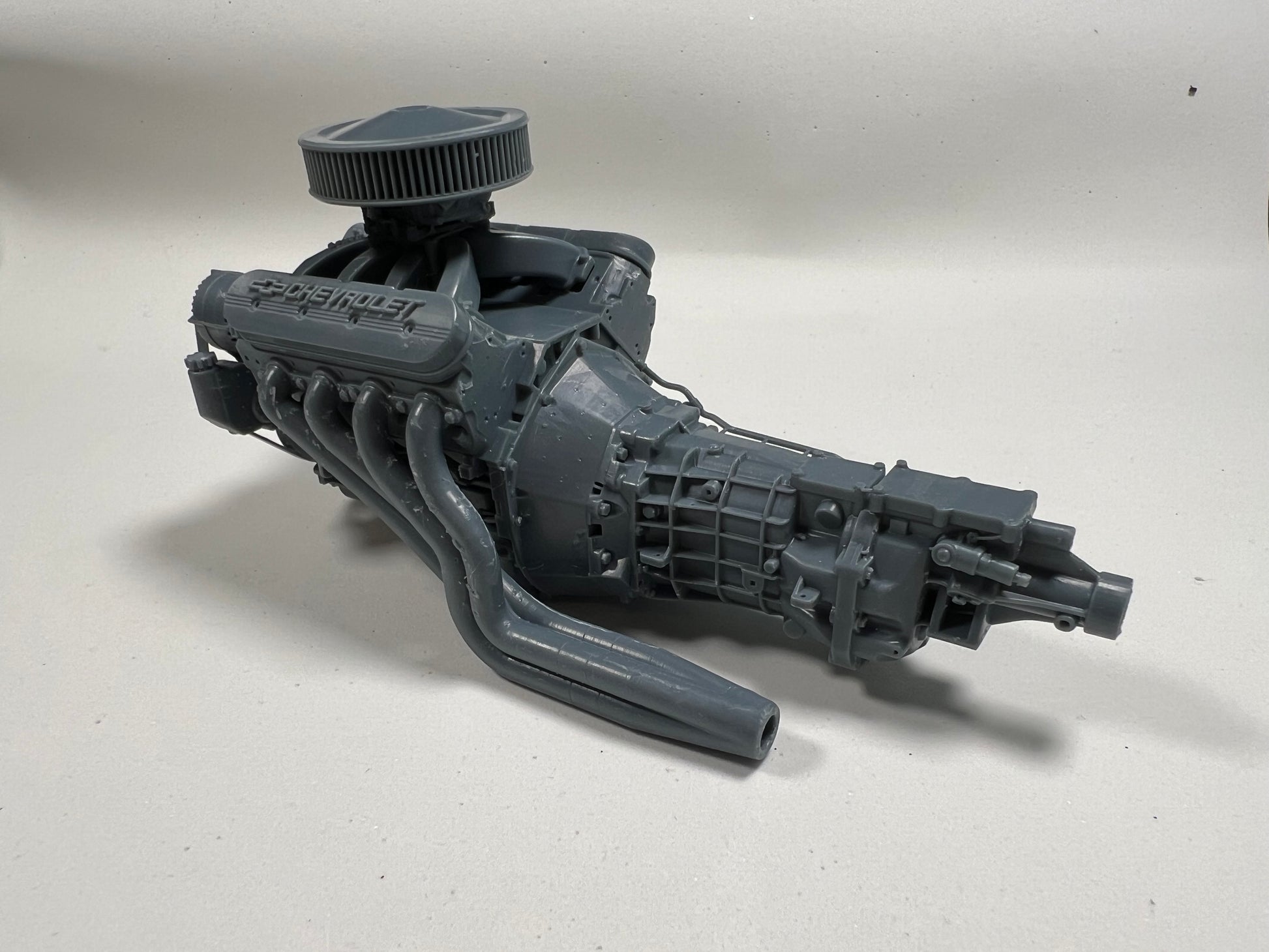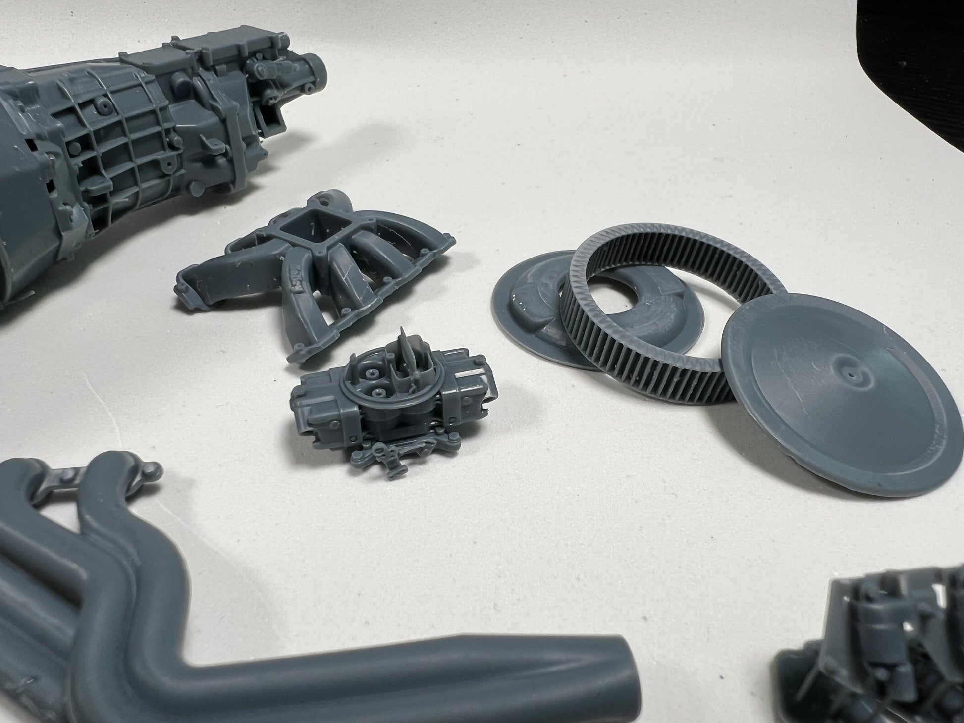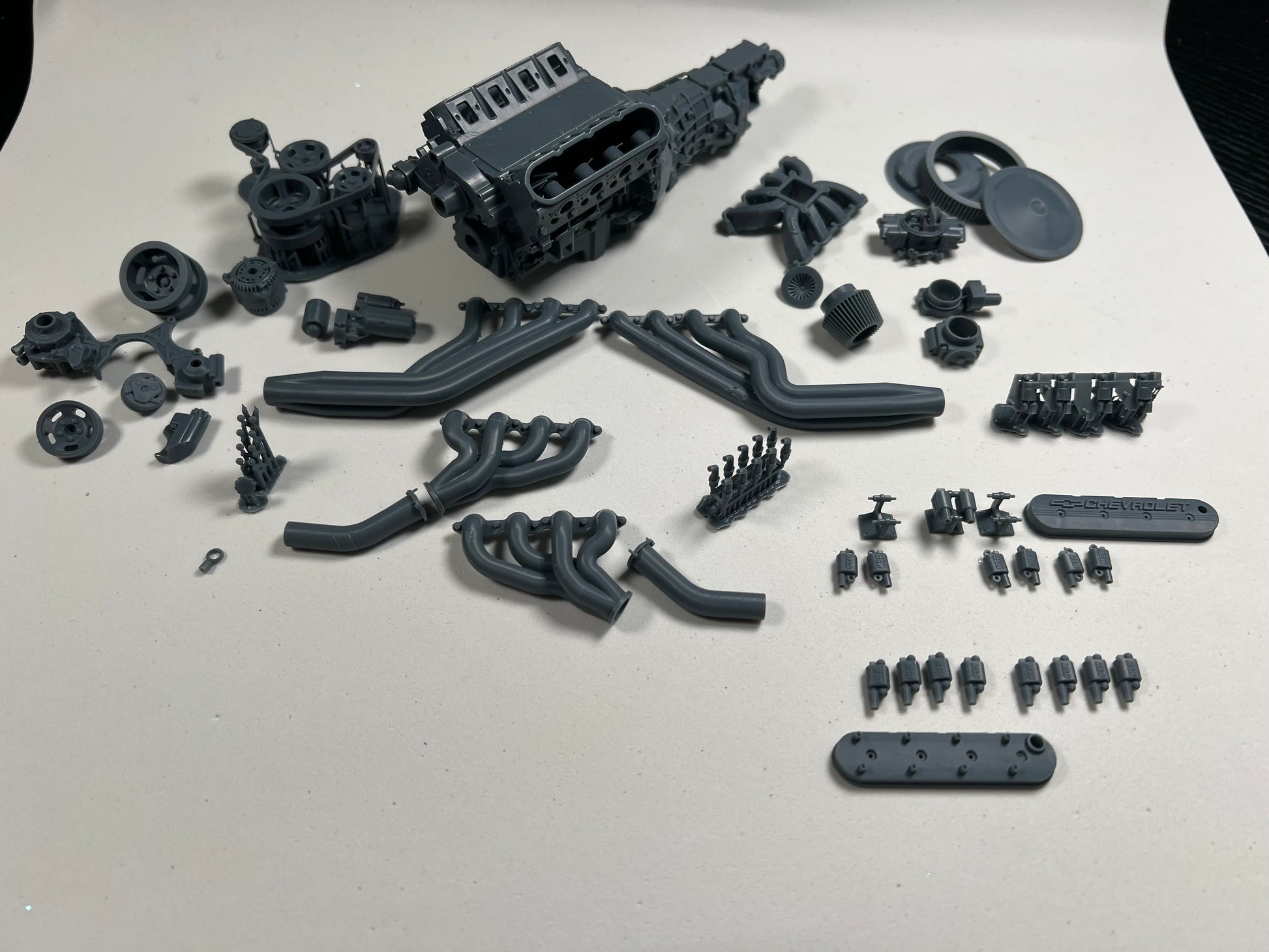 All of that detail is included, no matter the scale, available in 1/24th, 1/18th (for the diecast builders), 1/16th, 1/12th, 1/10th, and 1/8th. The standard configuration for the engine package has the engine assembled with heads, valley cover, Holley conversion oil pan, Holley offset conversion engine mounts, water pump, oil dipstick (handle is separate), bellhousing, and transmission together as they are all cast from the same aluminum. If you wish to have them printed separately, that option is available.