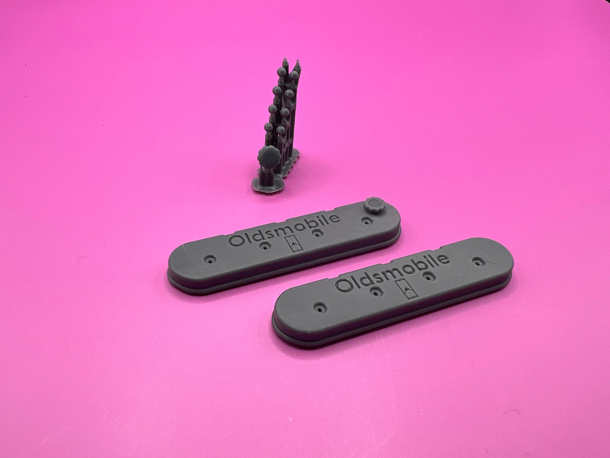 For that Oldsmobile build with our standard LS package components these valve covers are the solution! As with the standard LS Packages the hold down bolts and oil fill cap are separate from the valve covers on 1/12 and 1/8 scales, molded in the smaller scales. Sold as a matching pair!